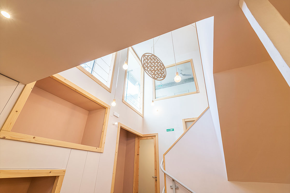Se busca la conexión visual y lumínica de los diferentes espacios, divididos en dos salsa de yoga, despachos y salas de consulta de terapias alternativas, situadas en dos plantas, baja y sótanos, unidas por el hueco central de la escalera, que se llena de vegetación, al igual que otros espacios del proyecto, convirtiéndose en el corazón y pulmón del proyecto, distribuyendo circulaciones luz y frescor por los espacios que lo rodean.